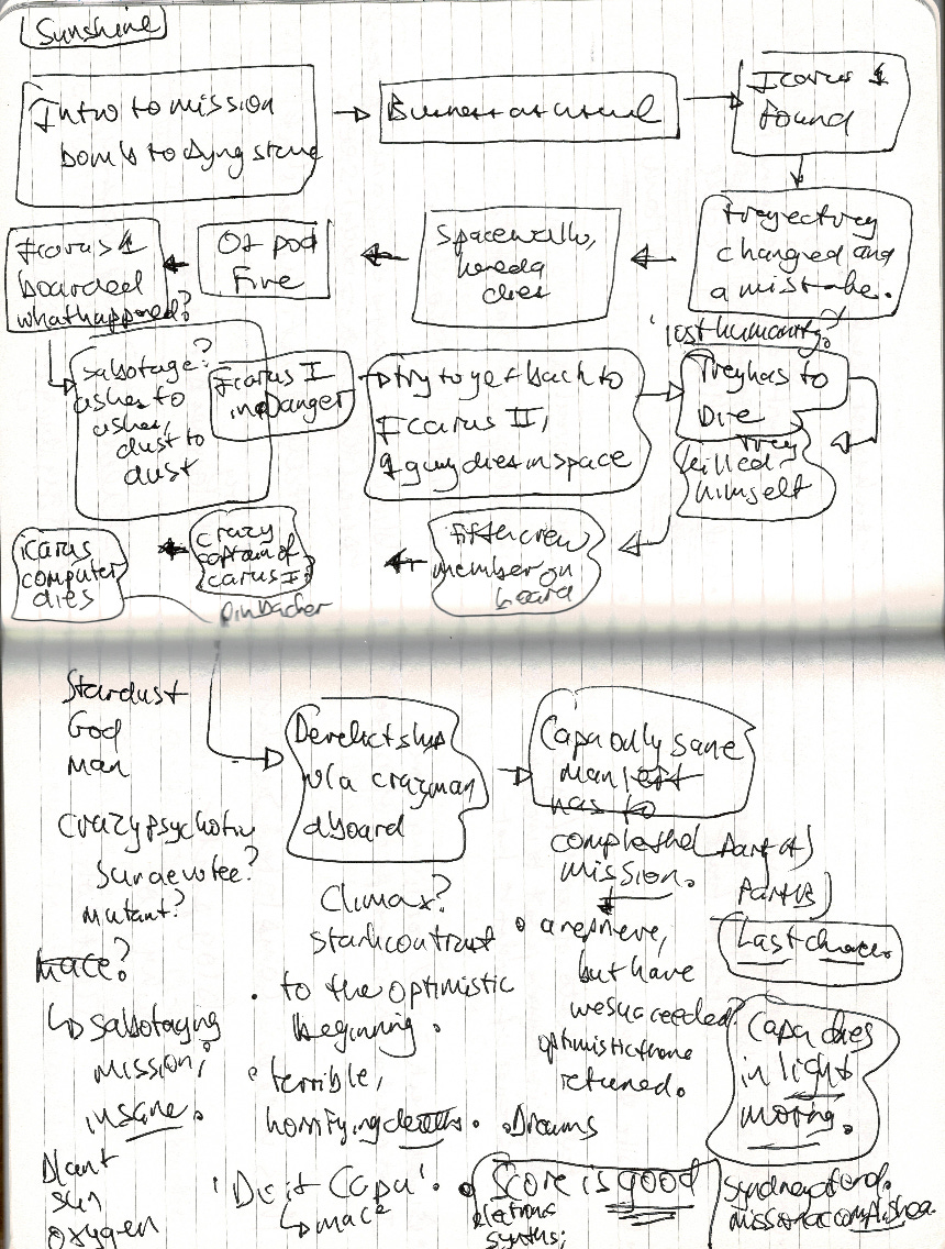 Aside from being a love letter to its antecedents, I wrote Sunshine as a film about atheism. A crew is en route to a God-like entity: the Sun. The Sun is larger and more powerful than we can imagine. The Sun gave us life, and can take it away. It is nurturing, in that it provides the means of our survival, but also terrifying and hostile, in that it will blind us if we look directly upon it, and its surface is as lethal to man as an environment can get.